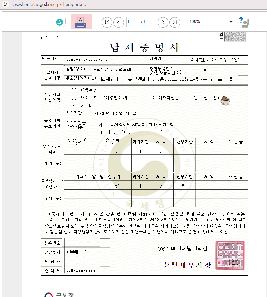 납세 증명: 개인이나 기업이 국세청에 납부해야 하는 세금(소득세, 부가가치세 등)을 모두 납부했다는 것을 공식적으로 증명합니다.