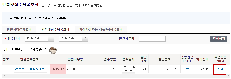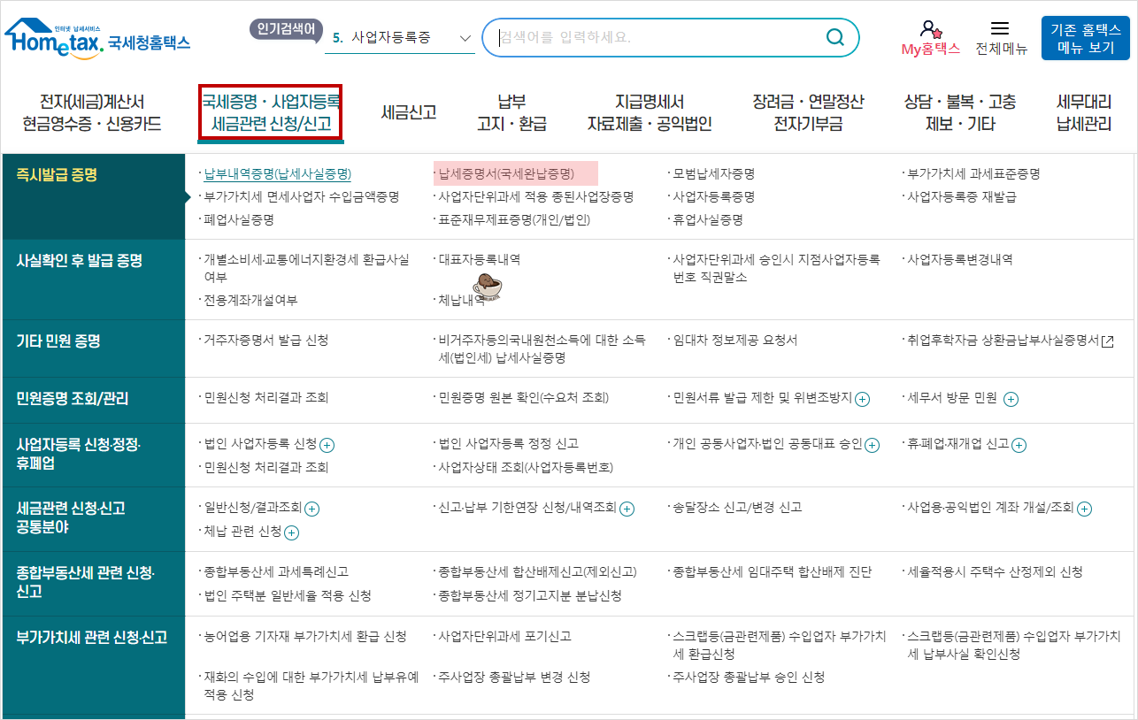 국세완납증명서 온라인 발급방법
