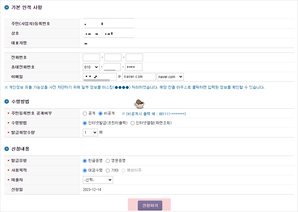 '납세증명서' 메뉴에서 로그인을 해두었기 때문에 기본적인 인적사항이 자동으로 기재됩니다. 필요한 수령방법과 신청 내용을 선택한 후 '신청하기' 버튼을 클릭합니다.