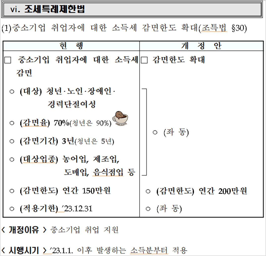 또한, 조세특례제한법 제30조가 일부 개정되어 감면한도가 기존 연간 150만원에서 200만원으로 증액됩니다.
