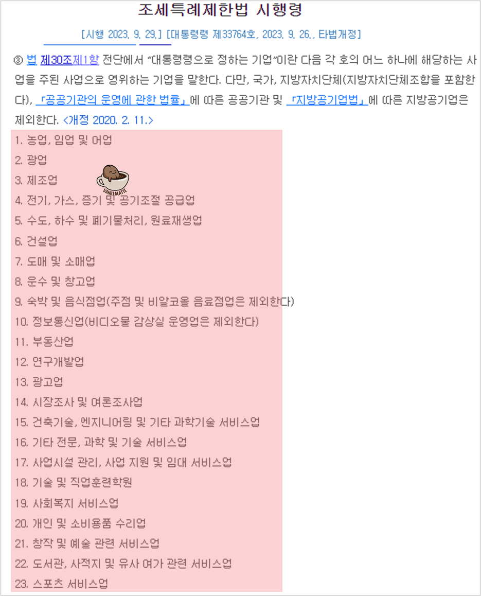 - 「조세특례제한법 시행령」 제27조 상의 감면대상 업종을 주된 사업으로 영위