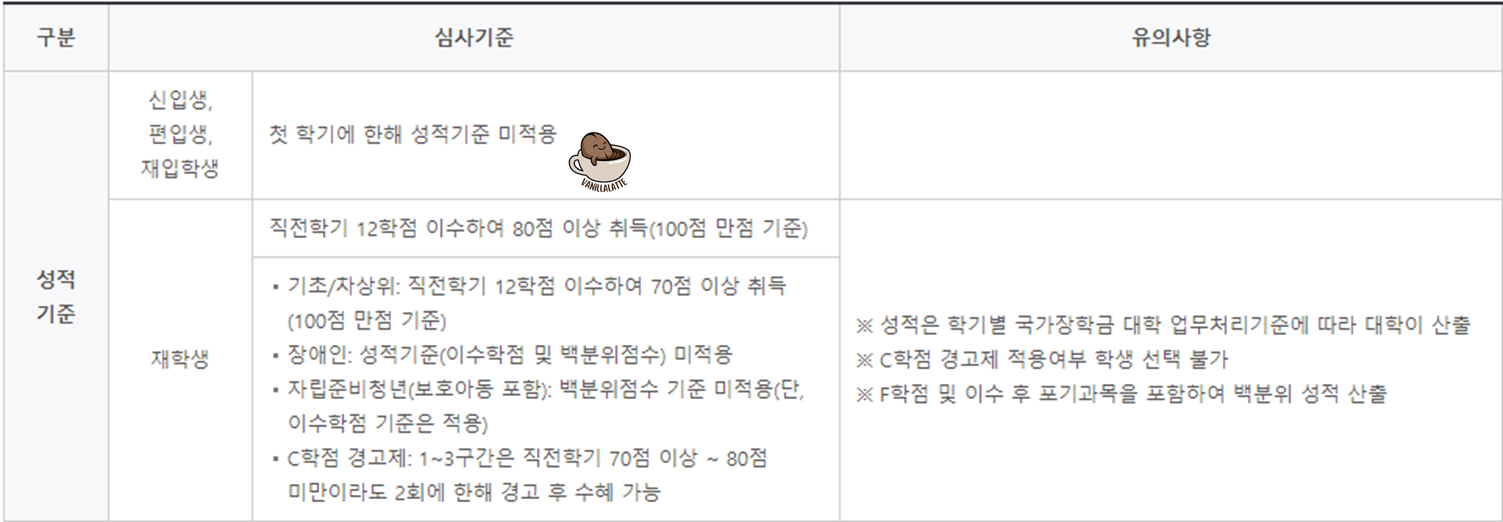 장학금 신청에는 성적 기준도 중요한 요소입니다. 직전 학기에 12학점 이상을 이수하고, 100점 만점에 80점(B 학점) 이상이어야 합니다. 기초·차상위계층 학생들은 70점(C 학점) 이상이면 됩니다. 장애 대학생이나 자립준비청년의 경우 성적 기준이 적용되지 않는다는 점도 참고하시기 바랍니다.