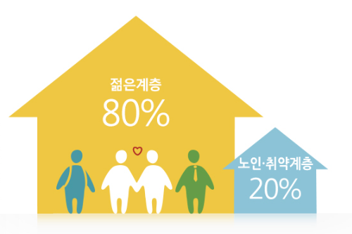 젊은 계층(대학생, 청년, 신혼부부)에게 80%, 노인, 취약계층에게 20% 비율로 공급됩니다.